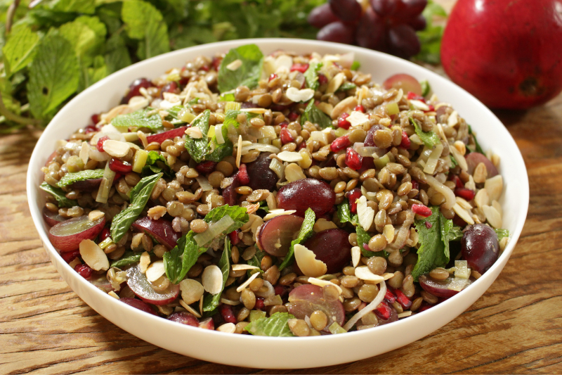 - Ingredientes principais: lentilha cozida, romã, cebola roxa, azeite de oliva e hortelã fresca.