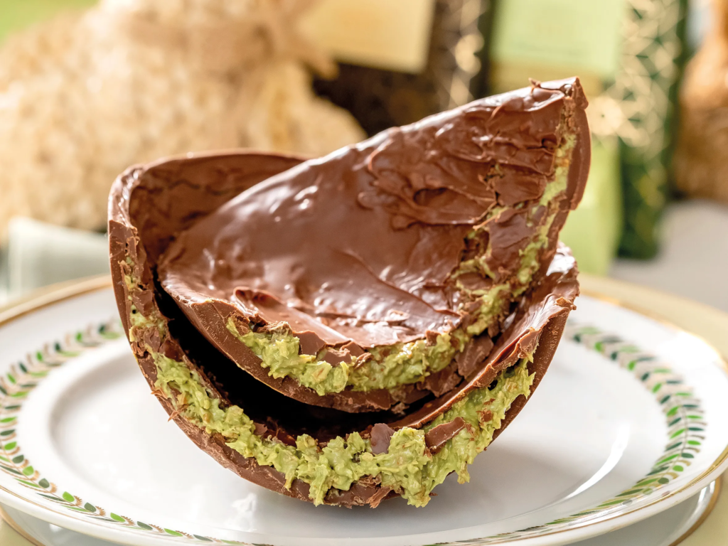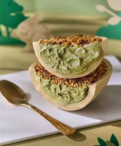 O pistache ainda manda. A tendência do chocolate Dubai, que combina creme de pistache com elementos crocantes, filtrou do TikTok para as chocolaterias com força total, e a Bacio di Latte soube aproveitar melhor do que a maioria. A casca é de chocolate branco com cobertura crocante, e o recheio de colher é denso o suficiente para não parecer mousse aguado. Para quem está presenteando alguém que acompanha tendências gastronômicas, esse ovo faz sentido sem precisar de explicação.