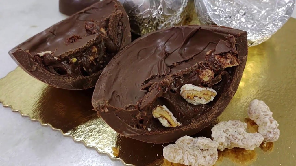 O pecan ainda não virou moda de massa no Brasil, e isso é exatamente o que coloca esse ovo nessa lista. Enquanto todo mundo está com o pistache na vitrine, o praliné de noz pecan tem sabor amanteigado e complexo que agrada quem já enjoou do pistache mas não quer voltar ao recheio de avelã de sempre. O formato praliné — castanha caramelizada triturada incorporada ao chocolate — dá textura sem precisar de crocante artificial. Confeitarias que trabalham com esse recheio estão conseguindo cobrar mais caro do que a média justamente porque a clientela percebe que aquilo não está em todo lugar.