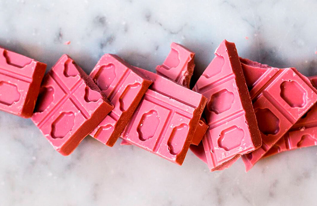 O ruby é o tipo mais recente no mercado — lançado em 2017 pela Barry Callebaut. Não tem adição de corante nem de aromatizante: a cor rosada e o sabor levemente frutado e ácido vêm do processamento específico dos grãos de cacau ruby, que preserva compostos que normalmente são perdidos na fermentação convencional.
